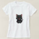 An adorable cartoon illustration of a chubby black kitten dressed in a spooky costume. The character is sitting and wearing a black vampire cape with red lining, featuring large, glittering golden eyes and a wide, cheerful smile that reveals tiny fangs.