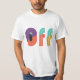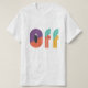 Un design de t-shirt dynamique avec le texte "OFF" en caractères gras et géométriques, avec un jeu de couleurs dynamique. Le design est moderne et attrayant, avec un fort impact graphique. OFF T-shirt design Vibrant Bold Police géométrique Colorful Modern Eye Catching Graphic design Mode Vêtements Marchandise