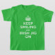 Irish Dancing, Irish Dancer's, Jig On T-shirt. Continuez à Jigging avec ce superbe t-shirt Irish Dancing. Cette chemise irlandaise amusante a un design classique Keep Calm avec une couronne qui a des shamrocks irlandais au lieu de la croix traditionnelle et de la fleur de lis. Le slogan dit : CONTINUEZ À SOURIR ET À JIG IRLANDAIS. Le thème irlandais se poursuit avec un shamrock d'apparence cool dans le O du mot ON. Ce tee-shirt irlandais amusant à thème est idéal pour tout danseur irlandais jeune ou âgé, et faire un fantastique cadeau de danse irlandaise que tout danseur irlandais sera ravi de recevoir. Plus t-shirts de danse irlandaise et cadeaux de danse irlandaise disponibles en magasin.
