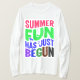 phrase ludique Summer Fun Has Just Begun en lettres colorées et audacieuses, parfait pour mettre l'ambiance pour une saison amusante à venir.