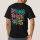 Un design de t-shirt coloré avec la mention audacieuse "Dreamers Forge Paths" dans une police vibrante multicolore.