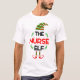 Cette image présente un t-shirt blanc avec un thème de Noël. Le texte "THE NURSE ELF" est affiché en lettres rouges et vertes festives, entouré d'une couronne de feuilles verts. Au-dessus du texte se trouve un casquette elfe rayé, et ci-dessous se trouvent des chaussures elfes avec des orteils de curling, créant un design de vacances ludique et joyeux.