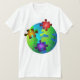 La chemise unique, à la mode, à la mode, mignonne et impressionnante avec une image colorée du globe de la terre, avec le bleu, puzzle rouge et jaune de ruban d'autisme rapièce. Symbolisation du soutien universel de l'autisme. Un amusement et un cadeau original pour des parents avec un enfant autiste, pour porter pendant le mois international de sensibilisation sur l'autisme d'avril. Ou un grand présent pour l'anniversaire de la maman ou du papa, mère ou fête des pères, ou Noël.