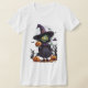 A wicked Halloween witch stands menacingly under a huge, glowing white full moon, its pale light illuminating her wild black hair and sinister smirk. She clutches one carved pumpkin in her clawed hand, their jagged grins flickering with an eerie inner glow. The twisted, leafless trees around her stretch like skeletal fingers against the night sky, and a chill wind blows her tattered purple robes. Her yellow eyes gleam with malice.