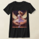 "Pour un design minimaliste mais élégant, un bel ange est représenté dans un contour blanc subtil sur un t-shirt noir. Les ailes de l'ange sont translucides avec un léger éclat, donnant un look vintage et rêveur. L'ange est dans une pose détendue avec ses mains légèrement surélevées, comme flottant dans le vent. Ses cheveux longs ondulés semblent souffler dans la brise légère, et son expression est calme et paisible, qui a l'air à la fois décontracté et élégant." Le point fort du design est de donner une touche de conte de fées avec élégance et simplicité.