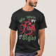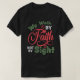 Ce t-shirt noir comporte les mots "We Walk" qui courent en haut dans une police verte légèrement en détresse. Ci-dessous, "BY" est dans une plus petite police verte au-dessus du mot "Faith", qui est écrit dans un grand script rouge courant avec de petits coeurs rouges. L'expression "NOT BY" est empilée à gauche dans une police verte plus petite, et "Sight" est affichée à droite dans une police verte plus grande avec une croix incorporée dans le "t". Cette conception transmet un message de foi chrétienne et de confiance sur le fait de compter uniquement sur ce qui est vu.
