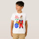 Festive elf garçon avec costume rouge bleu vert. Joyeux Noël à vous est écrit en amusant lettres enneigées en rouge et vert. Joyeux Nouvel An Aussi est écrit à l'intérieur de la grande boule d'ornement bleu avec ornement or en arrière - plan. Design original © 2021 TamiraZDesigns.
