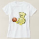 Un mignon ours en peluche jaune assis avec un ballon. Ce design semble vraiment efficace sur ce T-shirt féminin