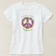 Ce t-shirt pour femmes présente un signe de paix fleuri dans les tons rose, jaune, orange, violet, vert, blanc, noir et turquoise. "Paix, amour et bonheur" entourent le signe de paix.