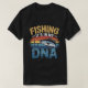 Ce t-shirt noir comporte le mot "FISHING" dans une police jaune et audacieuse, avec un look légèrement déprimé. En-dessous, l'expression "IT'S IN MY" est écrite dans une petite police blanche. En dessous, le mot "ADN" est affiché dans une grande police bleue en détresse. Une illustration détaillée d'un poisson avec un hameçon dans sa bouche est incorporée dans la conception, positionnée entre les deux phrases. L'arrière - plan est décoré dans un style coloré et en forme de coucher de soleil. Cette chemise est parfaite pour les amateurs de pêche qui veulent express leur passion.