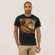 Ce T-shirt présente un dessin original et original d'un personnage en tranche de pizza surfant sur une vague géante de sauce marinara. La tranche de pizza, avec garnitures de pepperoni, est personnifiée avec des jambes et un bras tenant une mini pizza, chevauchant la vague avec une position confiante. Les tons chauds et le style surréaliste confèrent au design une ambiance humoristique et aventureuse, idéale pour les amateurs de pizzas et de surfs. L'arrière - plan sombre de la chemise fait apparaître l'oeuvre d'art unique, créant une pièce de déclaration audacieuse et ludique pour toute personne avec un sens amusant du style.