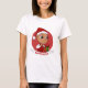 T-shirt féminin avec l'illustration d'un joli bébé souriant joyeux ou garçon, le bébé porte des vêtements rouges et blancs et tient un cadeau; avec texte modifiable modèle pour votre nom ou message, Noël vacances design