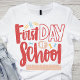 Célébrez l'excitation d'une nouvelle année scolaire avec ce T-shirt "First Day of School". Le design comprend des lettres rouges gaies avec des accents ludiques de clips de papier, des broches à poupées et une règle, capturant l'essence des fournitures scolaires et l'anticipation d'un nouveau départ. Parfait pour les étudiants, les enseignants et les parents, ce T-shirt est une façon délicieuse de marquer le début du voyage académique. Portez-le fièrement le premier jour pour répandre joie et enthousiasme en entrant dans la salle de classe.