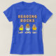 Reading rocks text with three happy rocks holding and reading books is a funny literacy gift design for book lovers, arians, literacy teachers and students.
