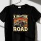 le design rustique des t-shirts de style vintage, avec un camion classique des années 1950 qui descend sur une route ouverte avec un arrière - plan couché de soleil et l'expression "Roi de la Route" 🚛 🌅 ✨