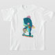 Cette illustration joyeuse représente une baleine à cheval sur un scooter avec un collier de coraux et d'étoiles de mer scintillant autour du cou, et un drôle de petit casque protégeant sa tête. Son dos est orné d'un tatouage floral, ce qui crée un contraste délicat avec les tons bleu et turquoise de sa peau.