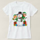 Un t-shirt blanc avec l'image d'un bonhomme de neige avec un casquette noir et une écharpe rouge et verte, entouré de deux elfes de caricature et de plusieurs cadeaux emballés. Les elfes portent des tenues vertes et des casquettes, et l'un d'eux tient un petit cadeau. Les cadeaux sont emballés dans du papier rouge, bleu et vert avec des arcs. Le bonhomme de neige a un nez de carotte et des boutons noirs. L'image est un dessin simple et coloré.