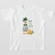 Un mignon t-shirt festif St. Patrick's Day avec un canard chanceux avec un casquette irlandais vert et cravate arc à côté d'une casserole d'or avec des shamrocks.