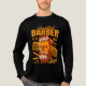 The centerpiece of the design features a stylized illustration of a bearded man with a perfectly coiffed pompadour, rendered in rich orange and deep brown tones. Surrounding the figure are the essential tools of the trade: a classic hair comb, a pair of sharp scissors, and a traditional straight razor.