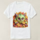 imaginez un design de chemise où une créature charmante aux teintes de chartreuse et mauve émerge joyeusement d'un monticule de feuilles d'automne. Cette bête a un aspect fantaisiste, presque surnaturel, avec des caractéristiques exagérées et un mélange de couleurs vibrantes qui éclatent contre l'arrière - plan crème. Les feuilles qui l'entourent sont rendus dans un style 3D hyper-surréaliste, avec des détails complexes et un sens de la profondeur qui les fait paraître flotter hors de la chemise. L'effet global est une scène ludique et fantastique qui capture une qualité magique et onirique.