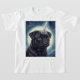 A stunning, digitally painted portrait featuring a stoic black pug transformed into the legendary Pug-nicorn. The artwork utilizes deep, rich blues and blacks contrasted with the warm amber glow of the eyes and the soft illumination of the moon and horn. The detailed fur texture and dreamlike, starry background make this a high-quality, eye-catching piece for any collector.