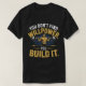Ce t-shirt noir présente le texte de motivation "VOUS NE TROUVEZ PAS DE PUISSANCE SAUVAGE, VOUS LE CONSTRUISEZ" organisé autour d'un graphique central. Le mot "WILLPOWER" est grand et dans une police jaune gras avec un contour foncé. Le graphique montre un individu musclé, qui semble être un homme à la peau claire, tenant une cloche sur ses épaules, suggérant un exercice de squat. L'arrière - plan a une texture bleue et grise.