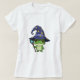 Cast a spell of cuteness with this enchanting digital illustration featuring a little green frog dressed as a sorcerer. The magical amphibian wears a large, crooked dark blue hat decorated with golden stars and a crescent moon. Holding a gnarly wooden staff topped with a glowing blue crystal, the frog stands with a confident, friendly smile and wide yellow eyes. The artwork combines fantasy elements with an adorable cartoon aesthetic.