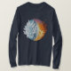Depiction of a stylized globe in which two seasons meet—winter and autumn. On the left side, a delicate, frosty plant spreads out, symbolizing cold and tranquility. On the right side, autumnal leaves glow in warm shades of red and gold, embodying transition, passing, and change. The gentle division between the two halves is reminiscent of yin and yang, the balance between cold and warmth, endings and new beginnings.