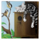 Eine niedliche Tabbierkatze schläft auf einem Holzhäuschen. Die Vögel, die dort leben, sind nicht erfreut.