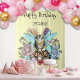Eine niedliche Tischtenniskatze mit blauen Feenflügeln sitzt auf einem Pilz mit einer Vielfalt, die viele farbenfrohe Blume rund um die Feenkatze ausmacht