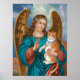 Ein blau gekleideter Engel trägt einen orangefarbenen Tisch.