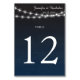 Une élégante carte de numéro de table de mariage moderne dans une aquarelle bleu marine avec des traits de brosse subtils. Au sommet de cette carte de coordination se trouvent deux cordes de lumières scintillantes, l'arrière - plan servant de faux ciel nocturne. Le texte entré dans les champs modèle est automatiquement ajouté à l'avant et à l'arrière de la carte.