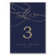 Cette calligraphie marine romantique fleurit numéro de table est parfait pour un simple mariage. Le design classique moderne comprend des tourbillons fantaisistes et des fleurs fantaisistes avec une magnifique typographie de feuille d'or en faux champagne. La carte s'imprime à l'avant et à l'arrière (double face). Ajoutez chaque numéro de table dont vous avez besoin à votre panier individuellement. Remarque : Ce design ne comporte pas de véritable feuille d'or. C'est un graphisme de haute qualité fait pour ressembler à du papier doré.