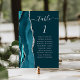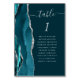 Le bord gauche de cette élégante carte de numéro de table mariage moderne comporte une bordure turquoise en aquarelle bleue, ornée d'une parties scintillant en faux argent. Le mot "table" apparaît dans le script d'écriture manuscrite gris argenté sur un arrière - plan bleu turquoise foncé. Ajoutez les noms de vos invités qui sont affectés à chaque table.