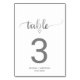 Cette simple carte de numéro de table de mariage de calligraphie argentée est parfaite pour un mariage élégant. Le design brillant argenté présente une typographie chic et un coeur métallique luxueux. Ajoutez chaque numéro de table dont vous avez besoin à votre panier individuellement. Remarque : Ce design ne présente pas de véritable feuille d'argent. C'est un graphisme de haute qualité fait pour ressembler à du papier argenté.