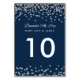 Design élégant "Table Number" de mariage avec Silver Faux Parties scintillant Confetti Marine Blue et texte de numéro de tableau personnalisé.