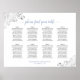 Ce magnifique tableau de sièges mariage présente un design chic et sophistiqué avec du texte gris foncé et bleu clair sur un arrière - plan blanc. Le titre est une élégante calligraphie de script lisant : s'il vous plaît trouver votre table. Les coins sont décorés de fraises argentées en faux feuillage, dans un motif floral délicat. Comprend 8 tables ou 80 personnes avec 10 places par table. Une belle façon d'aider vos clients à trouver leurs tables à la réception tout en ajoutant une touche de style.