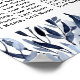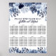 Le motif floral bleu-duvet contient de nombreuses nuances de bleu, du bleu indigo foncé au bleu pâle clair. S'il vous plaît trouver votre siège est écrit en gras et les noms des couples mariages sont écrits dans une police de caractères fantaisie et en gras.