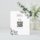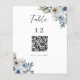 Élégant numéro de table de mariage floral bleu poussiéreux et avec code QR pour le menu mariage.