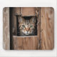 Tabby-Katze, die durch ein quadratisches Loch in der rustikalen Scheunentür guckt