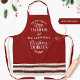 Agréable tablier de Fêtes rouge avec l'expression amusante "Tout ce dont vous avez besoin est Amour, rire et -votre nom de famille/nom d'entreprise- Cookies de Noël" dans un mélange de calligraphie manuscrite et typographie de bloc. Bas avec motif à rayures festives en rouge, or et blanc. Coordonner les invitations à la fête d'échange de cookies, les invitations à la fête de décoration de cookies ainsi que les étiquettes cadeaux de Noël.