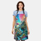 Un paysage imaginaire surréaliste avec des champignons éclatants, une flore alien vibrante, une cascade et un soleil tourbillonnant dans le ciel. La scène est riche en couleurs et en détails complexes, évoquant une atmosphère onirique et autre