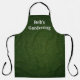 Ce tablier vert est agrémenté d'un motif en herbe et personnalisé avec un nom d'entreprise, ce qui le rend parfait pour la marque.