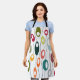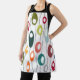 Ce tablier a un design moderne du milieu du siècle de lignes horizontales de couleur sur une ligne verticale noire avec des cercles.
