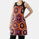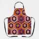 Cet tablier a un design géométrique d'hexagones dans quatre nuances d'orange sur un champ de bandes noires et violettes.