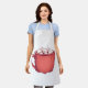 A person wearing a white apron featuring a graphic print of a large red mug filled with hot cocoa and marshmallows. This item is designed for use in a kitchen or as a festive gift, often associated with the holiday season.