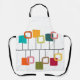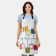Ce tablier au design moderne du milieu du siècle ressemble à un mobile avec des carrés solides et ouverts accrochés à celui-ci en turquoise, orange, vert, rouge et beige.