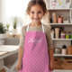 Un tablier pour enfants mignon avec un motif bicolore de pois rose clair sur un arrière - plan rose plus foncé. Personnalisez-le avec le nom de votre enfant dans une police de couleur blanche amusante.