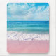 Ein tropisches Mousepad mit einem Foto aus einer Meereslandschaft mit türkisblauen Wellen, rosa Sand und einem aquablauen Himmel.