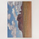 Ein Tagesfoto des Monument Valley zeigt mächtige rote Felsformationen gegen einen weiten, klaren, blauen Himmel und weiße Puffwolken. Das raue Sonnenlicht beleuchtet die dramatische Wüstenlandschaft und hebt die reichen Farben und tiefen Schatten der ikonischen Gesäß und Mesas hervor.